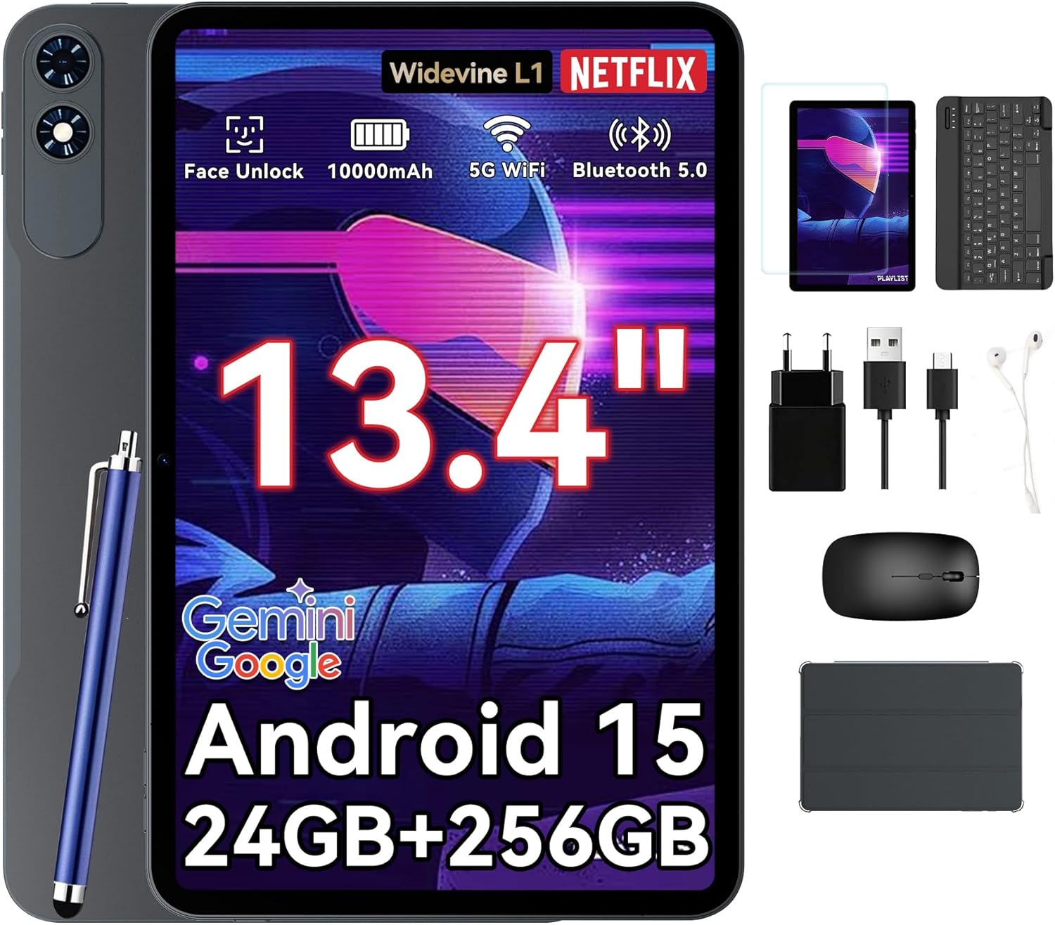 T60 Pro Tablet with Keyboard 13.4 Inches, Android 15, 24GB RAM 256GB ROM 2TB TF , Screen 120Hz FHD, Widevine L1, 10000mAh, Octa-Core, 4 Year Warranty, Grey
