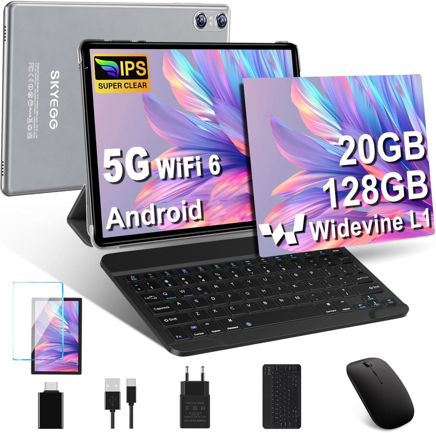 10 Inch Android Tablet 14 - 20GB RAM 128GB ROM Expandable up to 1TB , Widevine L1, WiFi 6, with Keyboard, Mouse and Case - Ideal for Work and Study - Grey